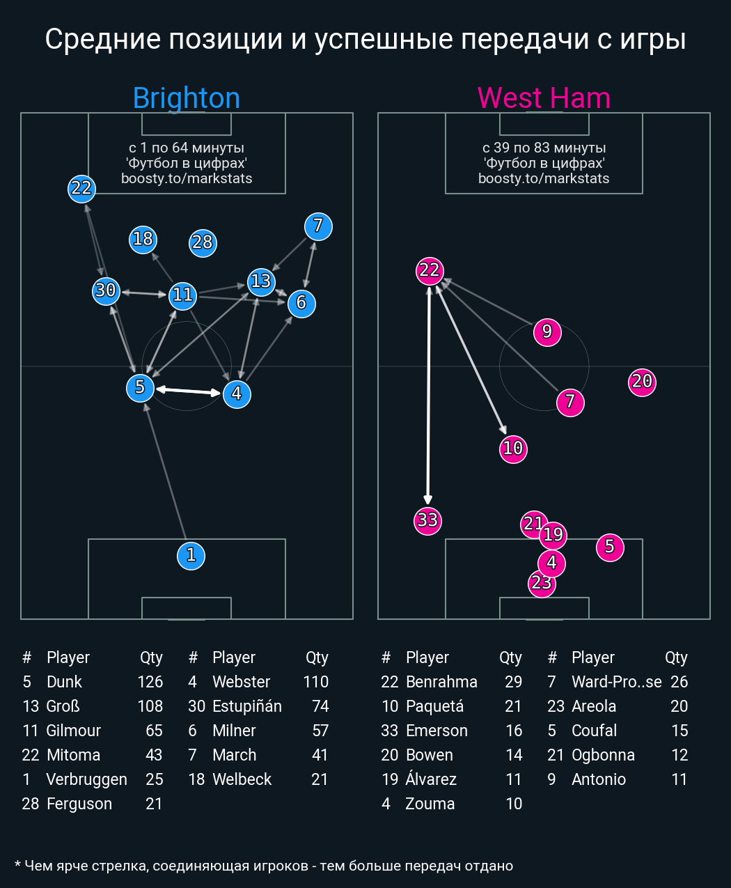 97 успешных передач из 110 попыток (5 с продвижением, 9 на трети соперника)
