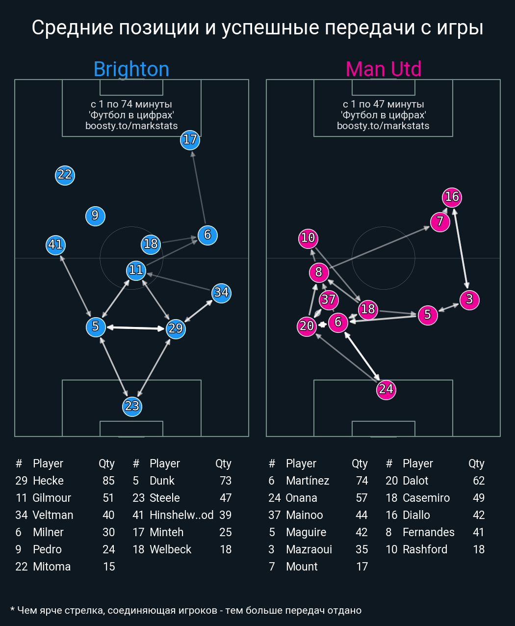 62 успешных передач из 68 попыток (1 под удар, 1 с продвижением, 3 на трети соперника)