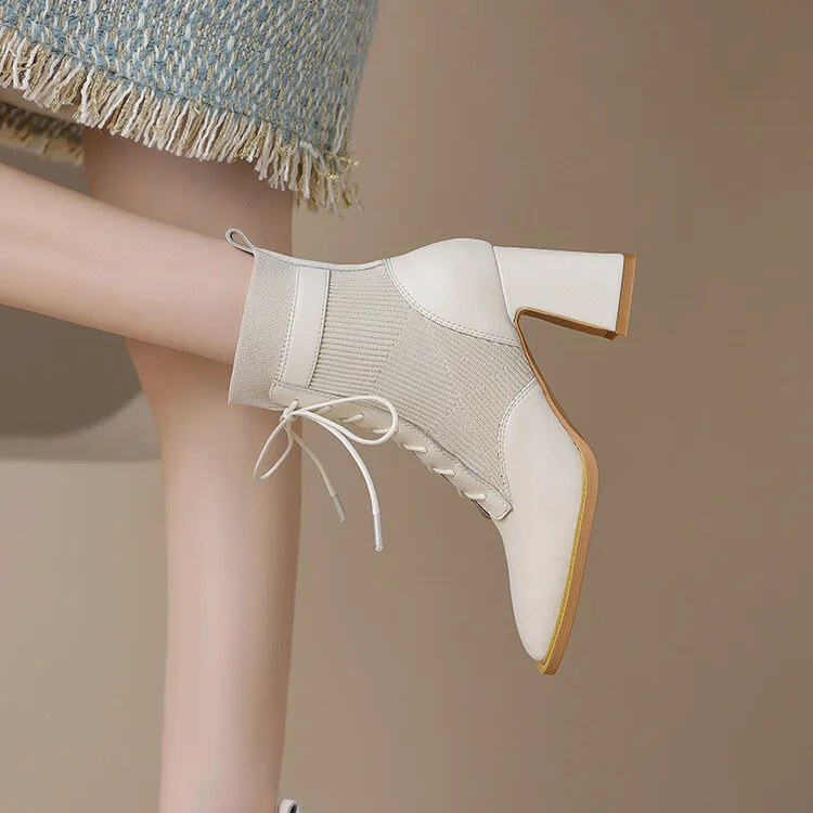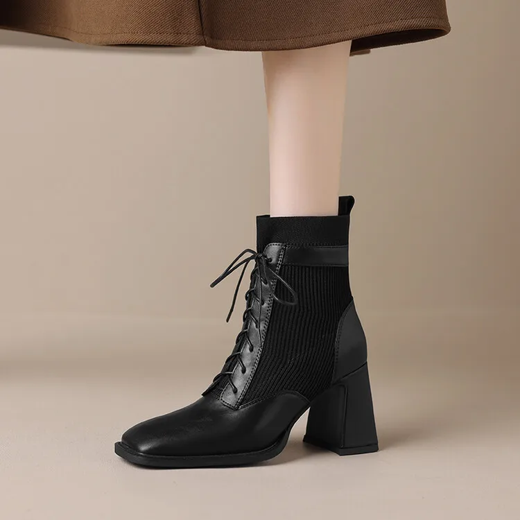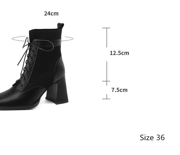 British Square Toe Women Autumn Boots Elastic Short Sock Botas Gladiator Lace Up Chunky High Heels Lady Riding Botines Femmes - Купить с бесплатной доставкой