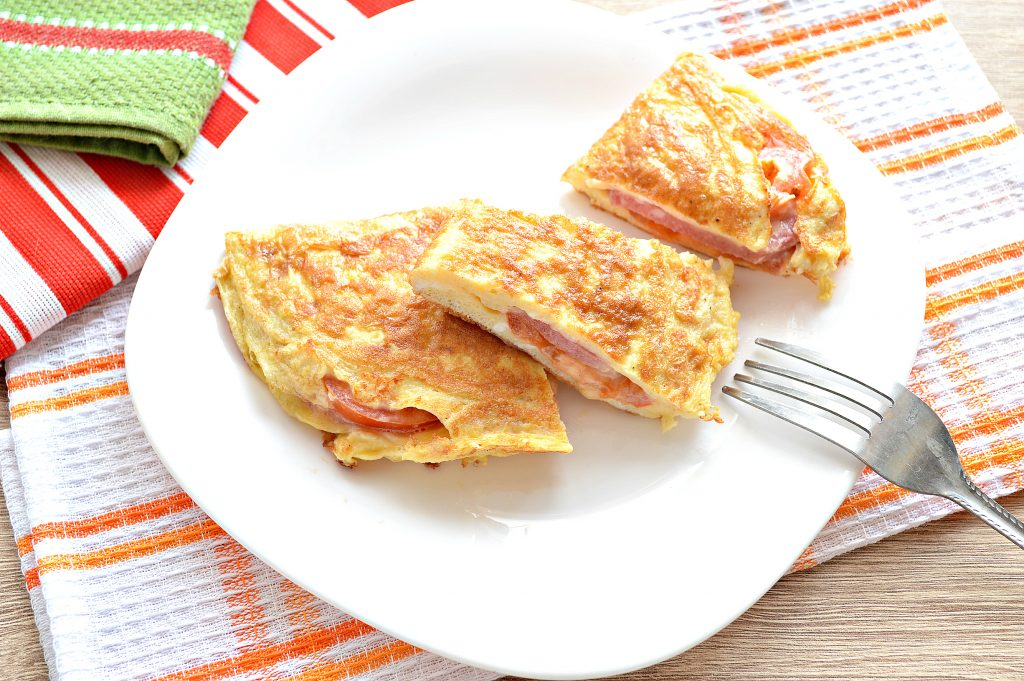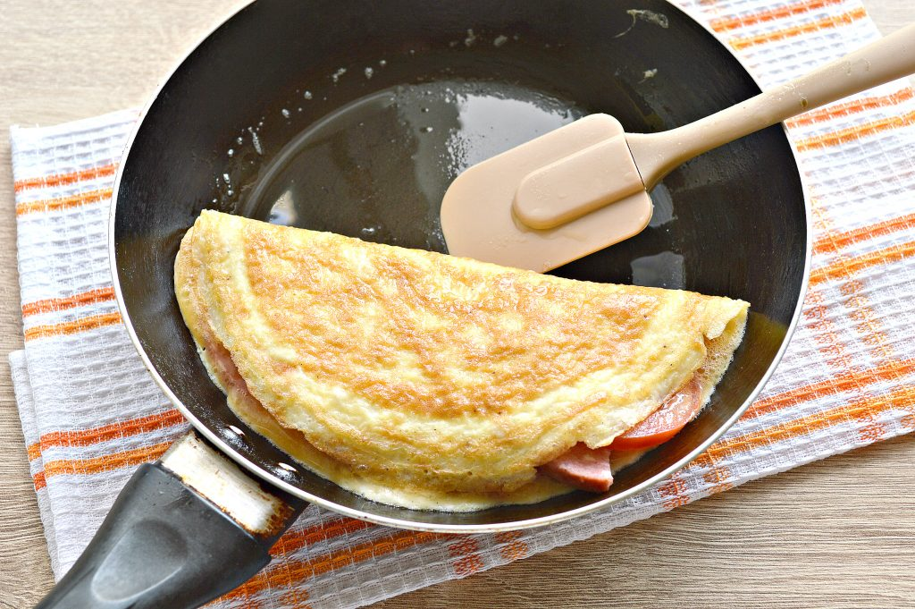 7. Начинку из колбасы и помидора аккуратно накрываем свободной стороной яичницы.