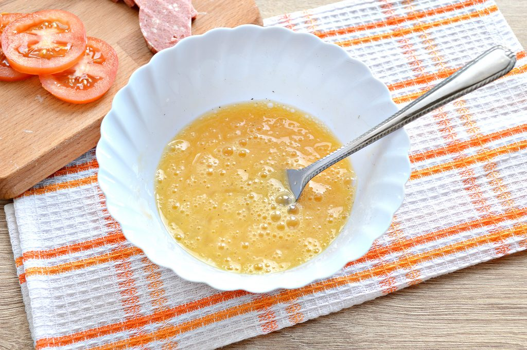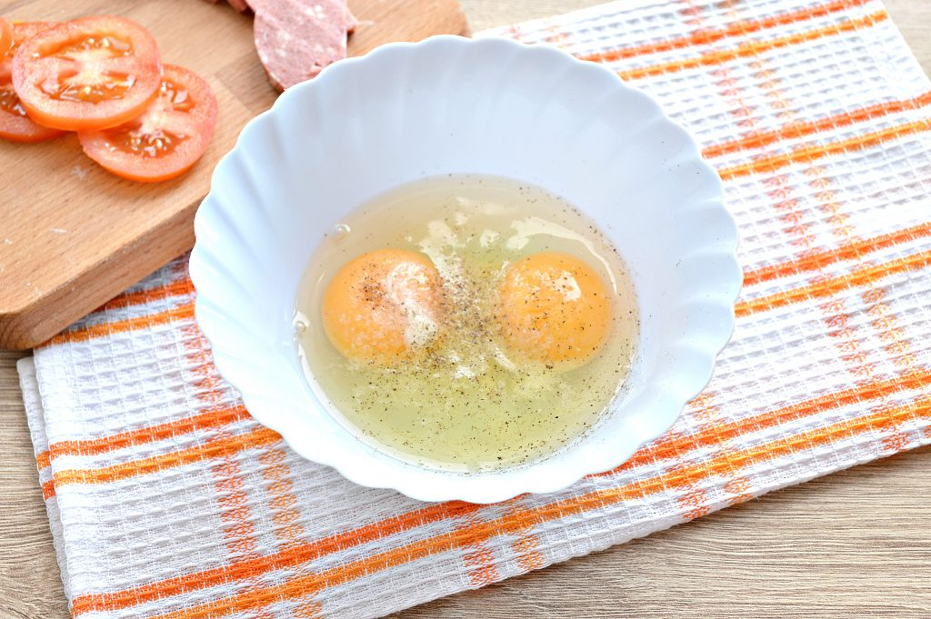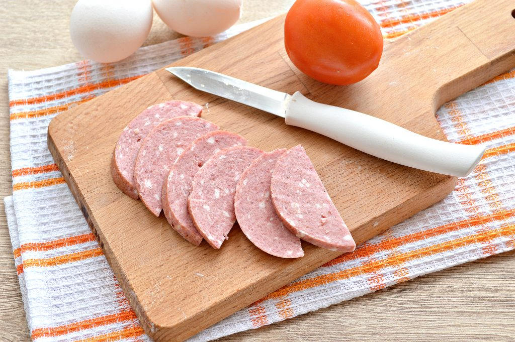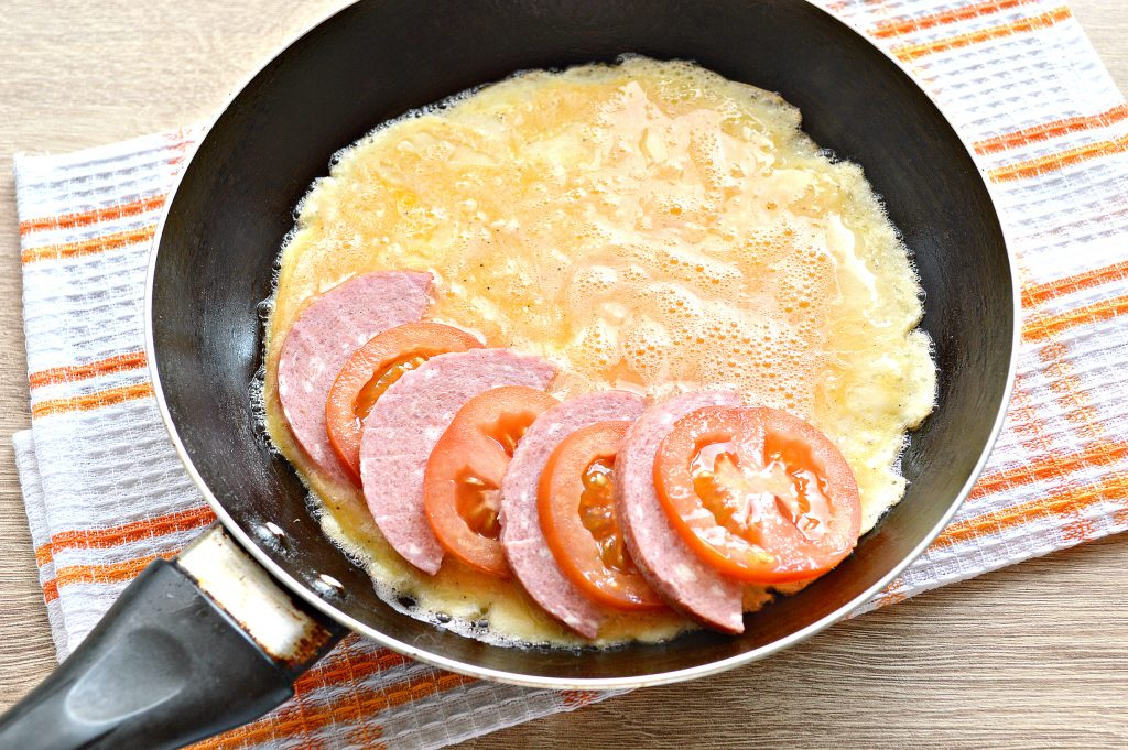 6. Когда яичная масса немного схватится, на одну сторону помещаем ломтики колбасы, чередуя их с помидором.