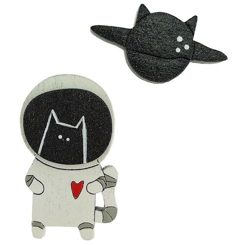 Kedi, sen sadece uzaysın! Boyut: 2*3cm 1,5*2,3cm Sabitleme: pim, pim Malzeme: ahşap, metal İçerik: iki broş, açıklamalı kağıt desteği, plastik torba Made in Russia