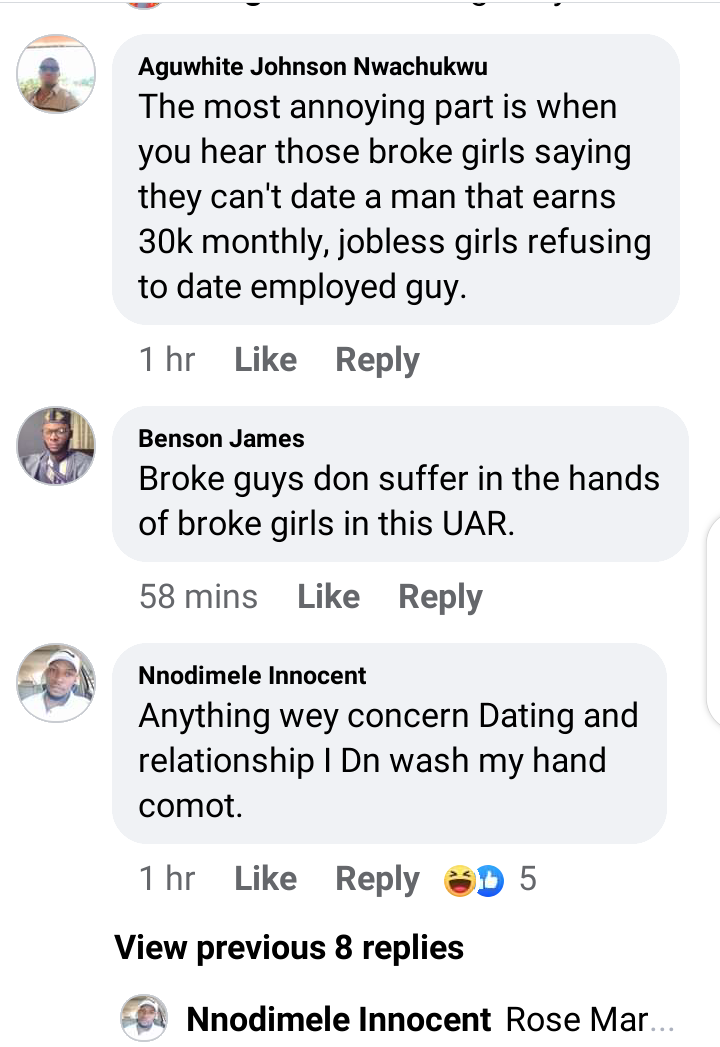 I have stopped condemning girls that doesn't settle for less, there are so many disadvantages of dating a broke guy namely: *talk about a boring relationship; when your female friends are going places with their rich bf, you are just there lying on his bed staring at each other's faces in his heated room .