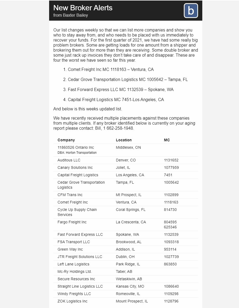 "Наш список меняется еженедельно, чтобы мы могли перечислить больше компаний и показать вам, от кого следует держаться подальше и кого нужно немедленно разместить у нас, чтобы вернуть ваши средства. В первом квартале 2021 года у нас было несколько действительно серьезных проблемных брокеров. Некоторые получают грузы на одну сумму от грузоотправителя и продают им больше, чем получают. Некоторые двойные брокеры, а некоторые просто выставляют счета, о которых не заботятся, и исчезают. Это четыре худших, которые мы видели до сих пор в этом году."