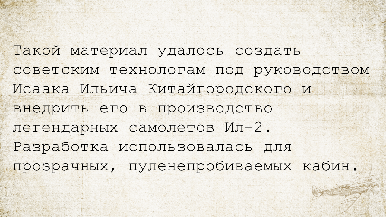 #НаукаПобедыВо время Великой Отечественной войны перед советскими инженерами была поставлена важнейшая научно-техническая задача: создать такое стекло, которое превышало бы по прочности в 25 раз обычное. И это была не прихоть руководства, а насущная необходимость, продиктованная реалиями военной авиации. Огромным недостатком в самолетах того времени было отсутствие защиты пилота от пулеметного огня противника. Для «фонаря» кабины требовалось особое стекло.