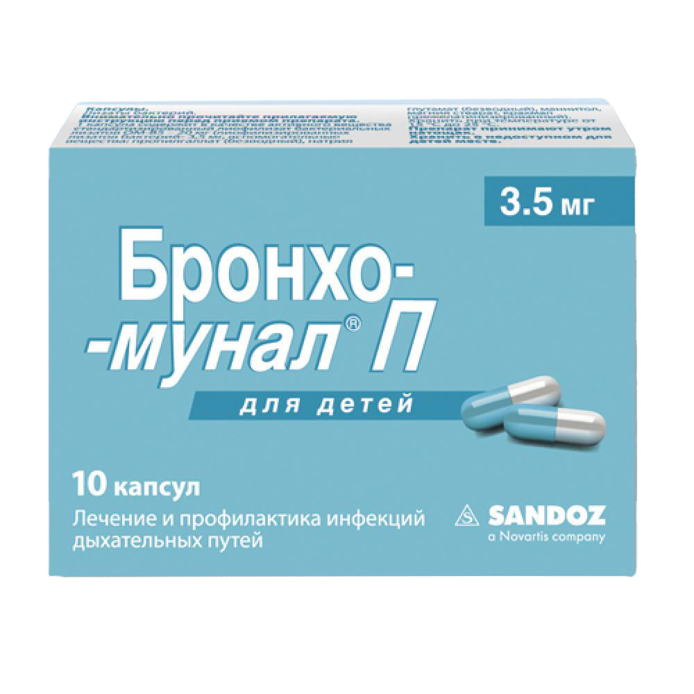 Бронхо-мунал® П, капсулы, 3,5 мг . По 10 капс . в блистере . По 1 или 3 бл . в картонной пачке . Производитель Сандоз д .д ., Веровшкова 57, 1000, Любляна, Словения . Произведено: Лек д .д ., Веровшкова 57, г . Любляна, Словения . БРОНХО-МУНАЛ ® — торговый знак ОМ PHARMA, Женева, Швейцария .