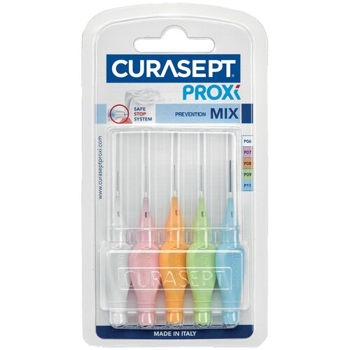 Les brosses de la série CURASEPT PROXI PREVENTION sont recommandées pour les espaces interdentaires étroits et les gencives saines. Les brosses interdentaires aident à éliminer la plaque dentaire, à réduire les saignements des gencives et à prévenir la mauvaise haleine. Idéal pour nettoyer les implants et les appareils orthodontiques. Les poils en nylon doux et épais nettoient efficacement les espaces interdentaires. La fine tige d'acier recouverte d'élastomère thermoplastique est sans danger pour les gencives et l'émail. Une butée amortissante à la base de la tige évite d'endommager les gencives. Le set Curasept Proxi Mix contient 5 brosses différentes : P06 - avec un diamètre de tige de 0,6 mm ; P07 - avec un diamètre de tige de 0,7 mm ; un diamètre de tige de 0,8 mm ; P09 - avec un diamètre de tige de 0,9 mm ; P11 - avec un diamètre de tige de 1,1 mm ; Chaque brosse a un capuchon de protection qui peut être utilisé pour rallonger le manche ;Curasept Proxi est une gamme innovante de brosses interdentaires qui répond à des normes élevées de qualité et de sécurité. La gamme de brosses Curasept Proxi Prevention est conçue pour le nettoyage quotidien des espaces interdentaires de petite et moyenne taille pour le traitement et la prévention de la gingivite, de la parodontite et des caries. les surfaces latérales des dents. La tige en acier fine et flexible est recouverte d'un élastomère thermoplastique qui est doux pour la surface des dents et des gencives au toucher. La butée absorbant les chocs à la base de la tige élimine les traumatismes des gencives, offre une stabilité et un contrôle amélioré pendant l'utilisation. Les poils ultra-fins épais et doux en nylon nettoient rapidement et en douceur les surfaces latérales des dents. Avec la bonne taille de brosse, 1 à 2 mouvements de va-et-vient suffisent pour un nettoyage efficace. Le set Curasept Proxi Mix contient 5 brosses différentes : P06 - avec un diamètre de tige de 0,6 mm P07 - avec un diamètre de tige de 0,7 mm P08. - avec un diamètre de tige de 0,8 mm P09 - avec un diamètre de tige de 0,9 mm P11 - avec un diamètre de tige de 1,1 mm Le capuchon de protection peut être utilisé pour augmenter la longueur du manche. La durée de vie d'une brosse est individuelle. Cela peut varier de 2 à 3 semaines et dépend de la bonne technique d'utilisation et de la charge exercée sur la brosse - à quelle fréquence vous l'utilisez. Grâce à leur haute qualité, les brosses Curasept Proxi ont une longue durée de vie. La brosse doit être remplacée si les poils sont perdus ou déformés, ainsi que si la tige est déformée de manière irréversible, ce qui se produit le plus souvent à la suite d'une mauvaise utilisation. Tous les espaces interdentaires sont de tailles différentes, même chez une seule personne. En règle générale, au moins 2 à 3 tailles de pinceaux sont nécessaires pour combler efficacement toutes les lacunes. Nous vous recommandons de contacter votre dentiste pour une sélection personnelle de brosses et une formation aux techniques sûres pour les utiliser.