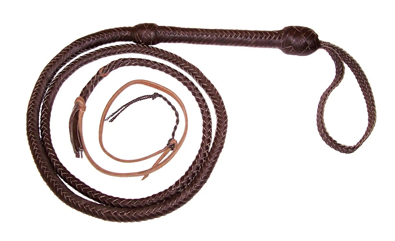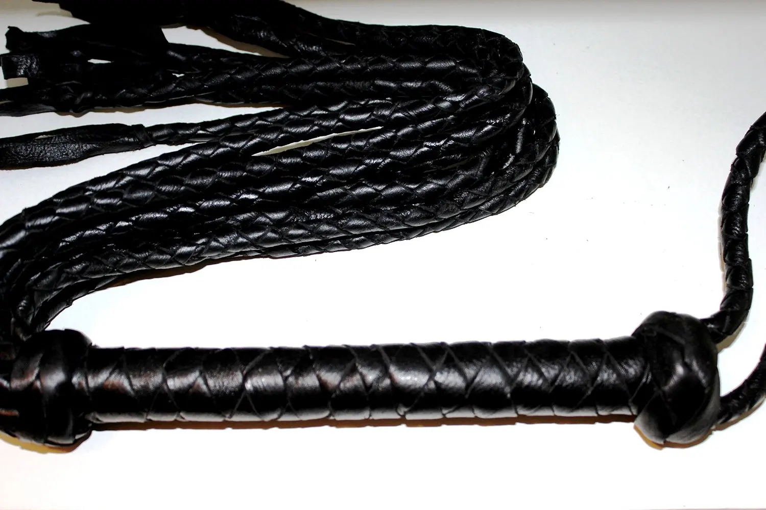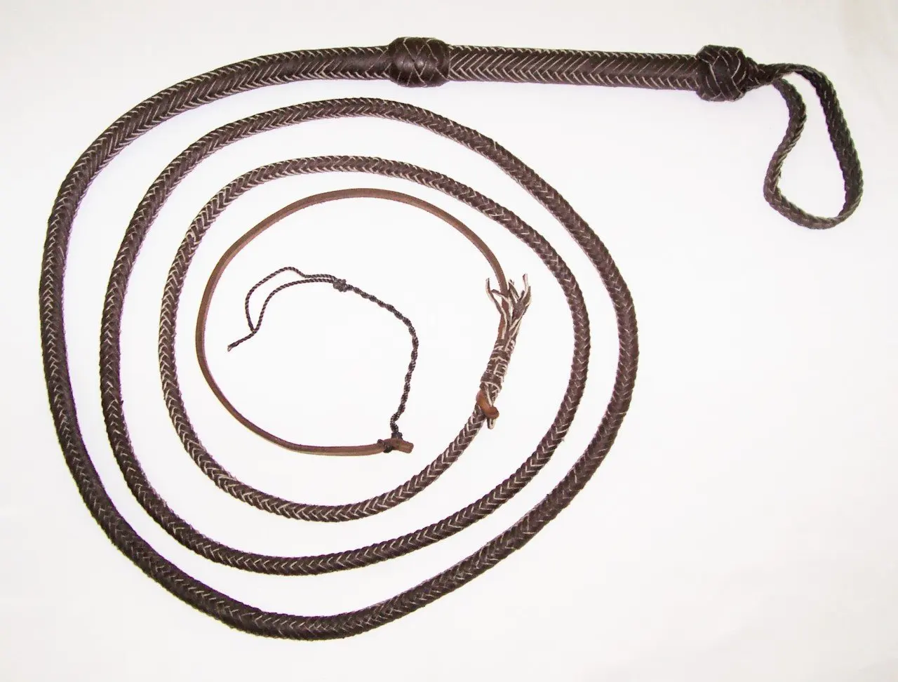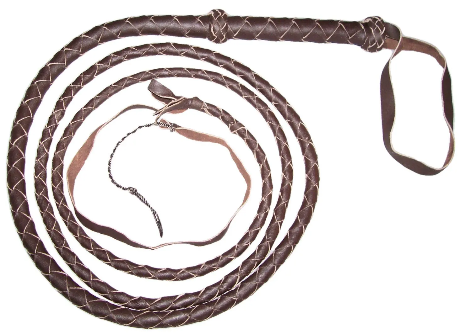 Nine-tailed Whip, handmade braided leather. Braided tails of brown leather with diamond knots topped in fringes. Braided handle of flexible leather type whip of a tail in brown and natural color. Decorative spike knots at the beginning of the gripping area. Flat Braid wristband.