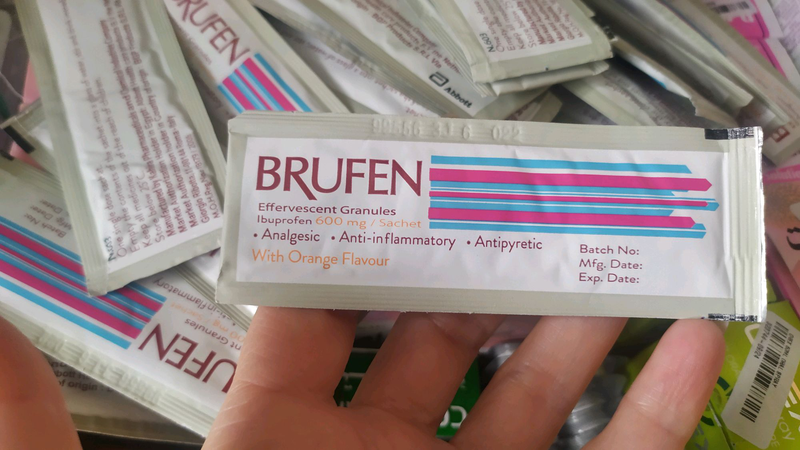 для медичного застосування препарату . БРУФЕН ® . (BRUFEN ®) Склад: діюча речовина: ібупрофен; 1 саше містить ібупрофену 600 мг; допоміжні речовини: кислота яблучна, сахарин натрію, сахароза, повідон, ароматизатор апельсиновий, натрію лаурилсульфат, натрію гідрокарбонат, натрію . . .