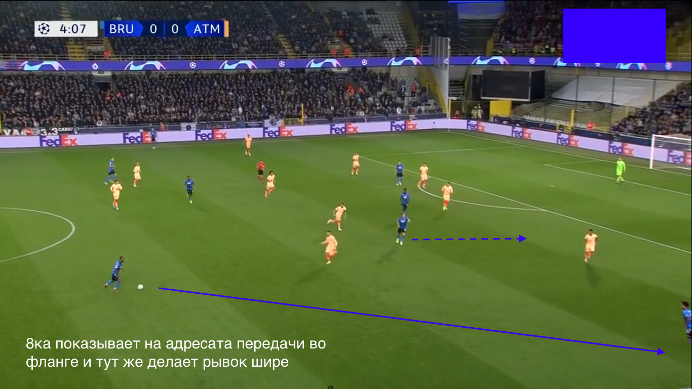 В той же игре с “Атлетико” наиболее яркий пример создания пространства в полуфланге, содержавший сразу все вышеописанные передвижения - эпизод на 29 минуте. Сначала чуть глубже оттянулся форвард, а “восьмёрка” поднялась выше и заняла его позицию - пока ничего опасного, “Атлетико” не запутался и спокойно передал опеку над оппонентами. Затем номинальный форвард уже с позиции “восьмёрки” (что указывает на отличное понимание принципов и целей владение всех игроков независимо от позиции) делает открывание в ширину по диагонали и утягивает за собой Коке - полуфланг расчищается, и в него тут же, своевременно заполняя зону, поддерживая структуру треугольника и открывая линию передачи на ушедшего к бровке форварда-"восьмёрку", открывается латераль. После получения передачи номинальный форвард отдает пас в расчищенный полуфланг на открывающегося там на скорости вингбека - он разгоняется и доводит нападение до штрафной. Идеальная атака в рамках манеры “Брюгге” с соблюдением сразу всех основных её элементов.