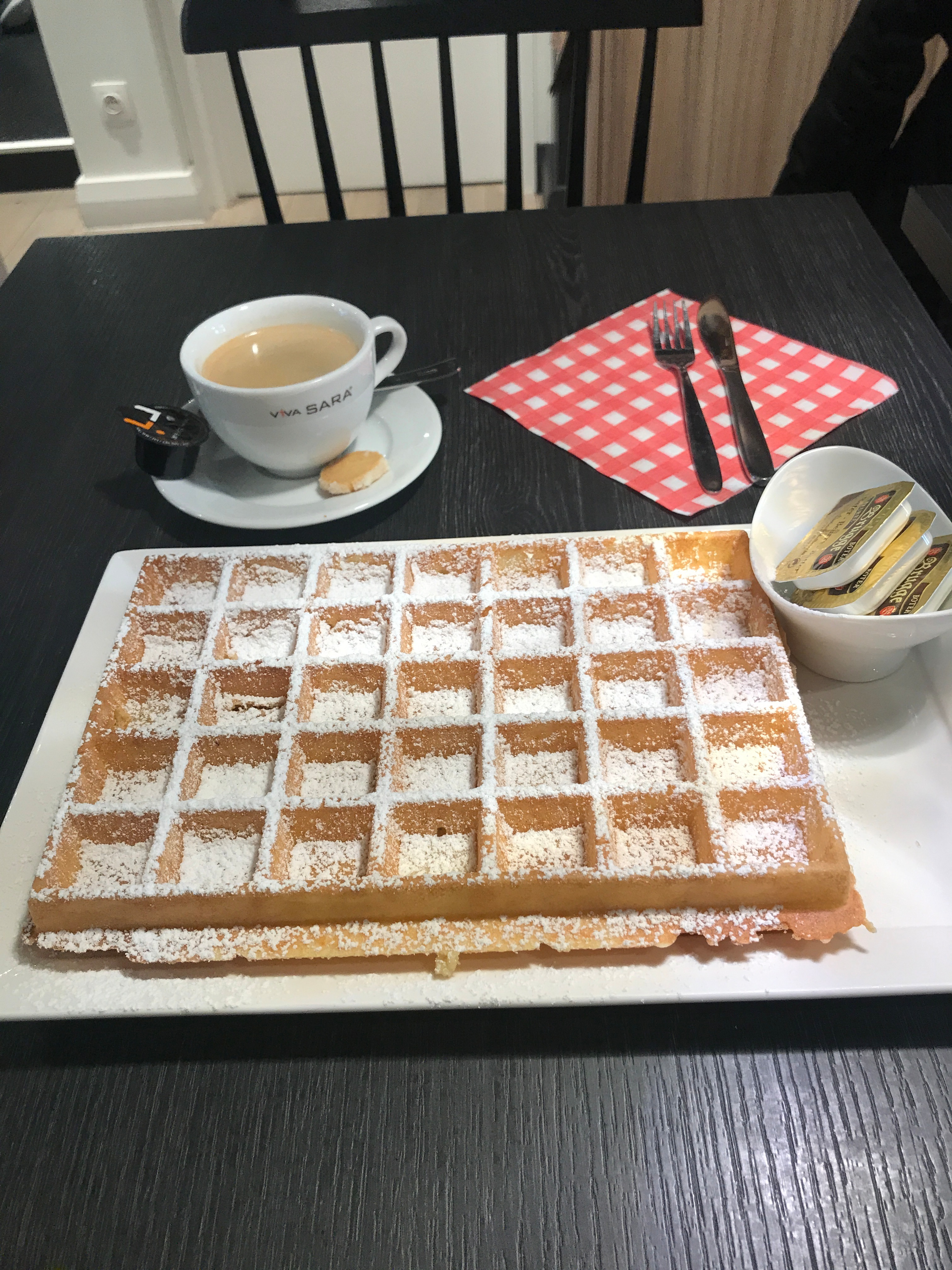 Что касается бельгийских вафель, мне не очень понравилось. Притом, что я специально зашел, как я полагаю, в одно из самых дорогих мест. Штука была огромная, но совершенно пустая.