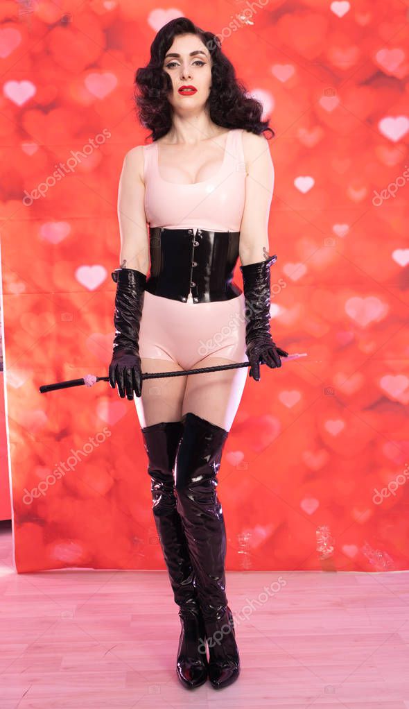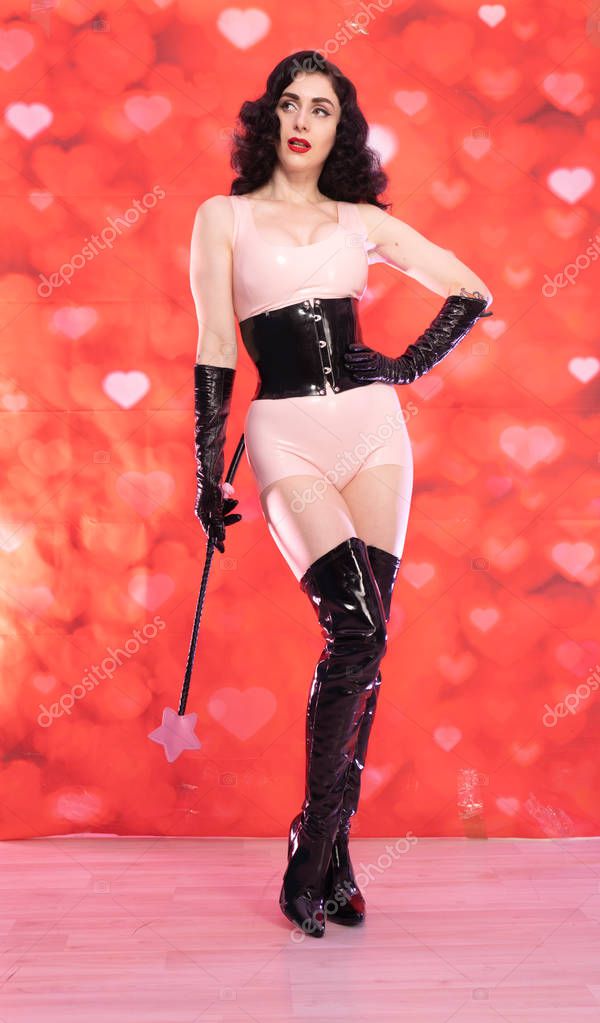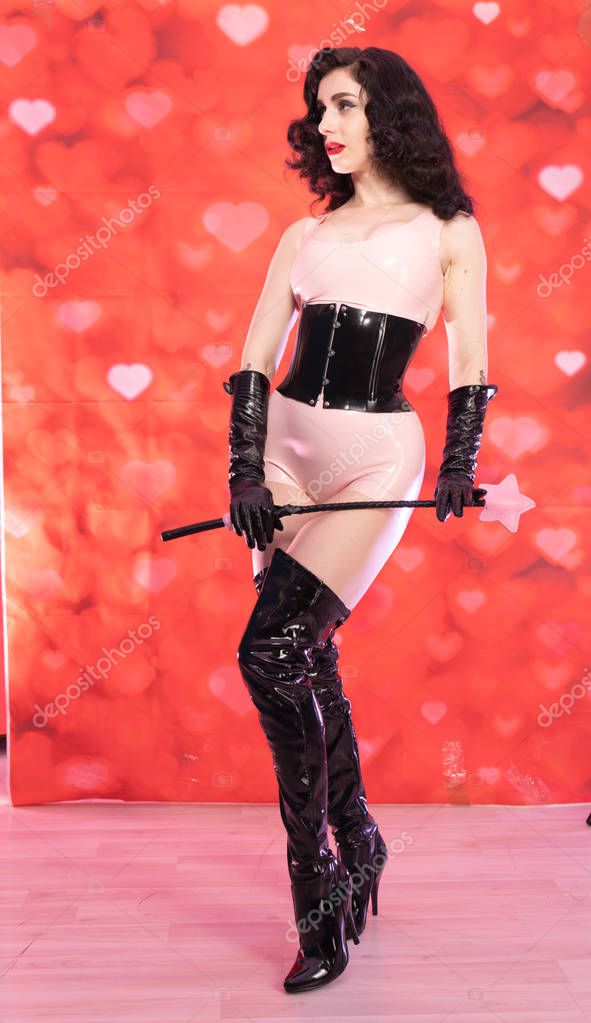 Брюнетка в латексных сапогах и перчатках