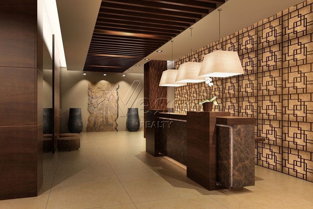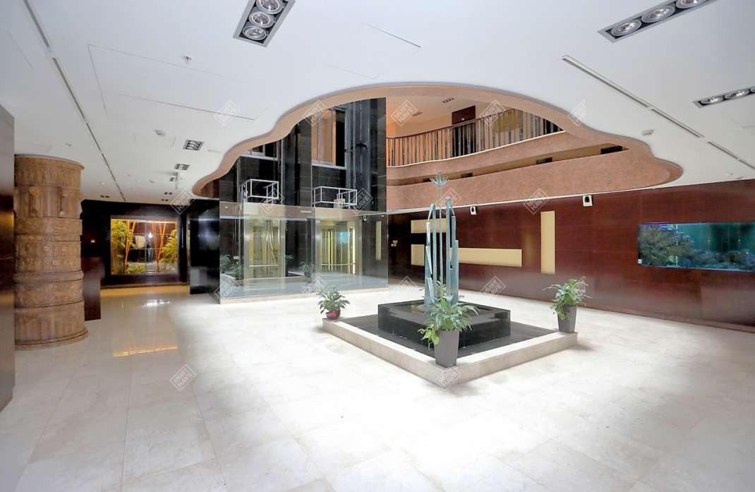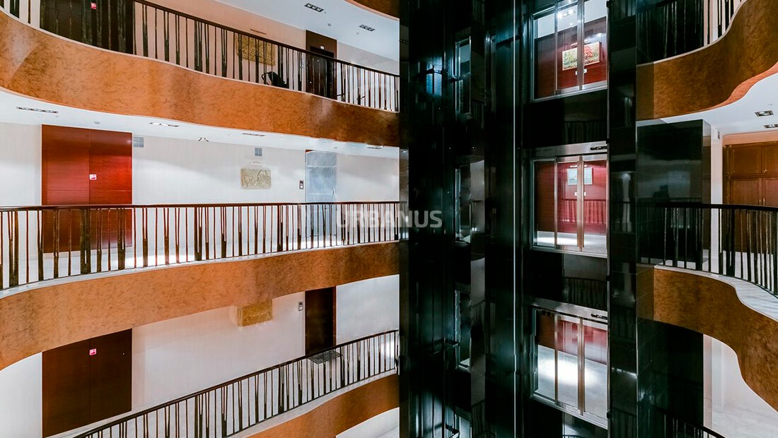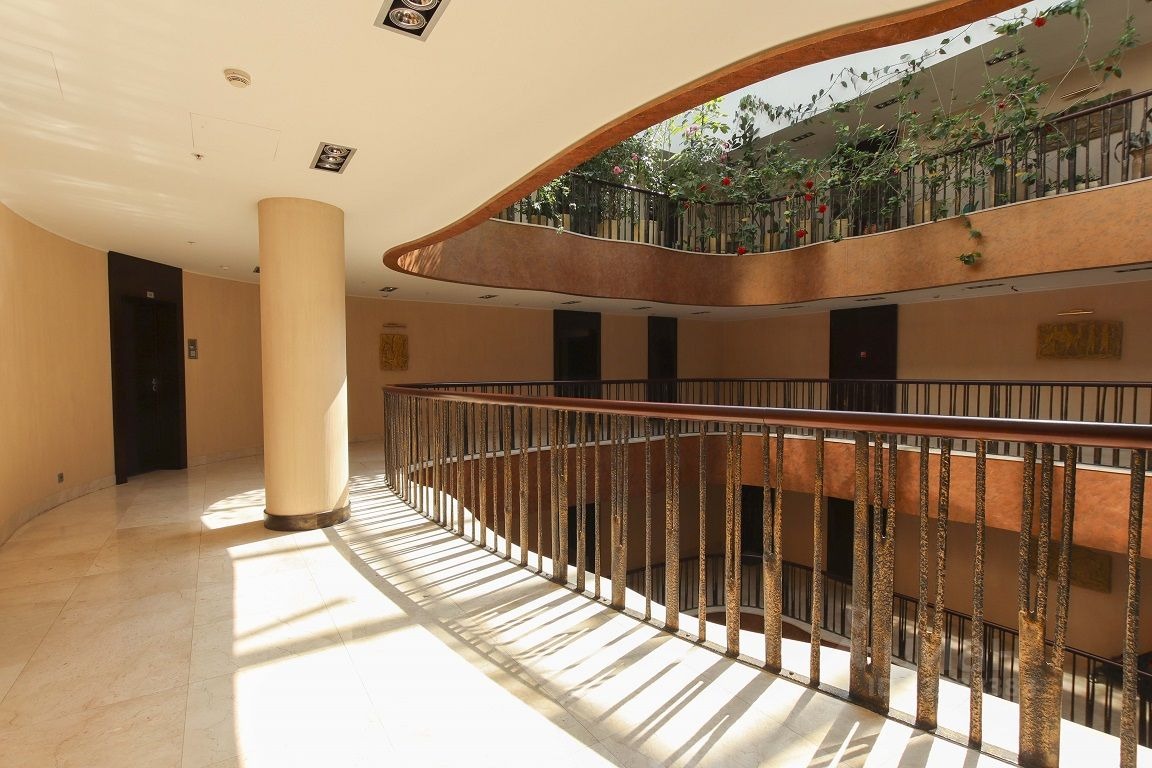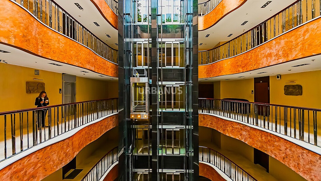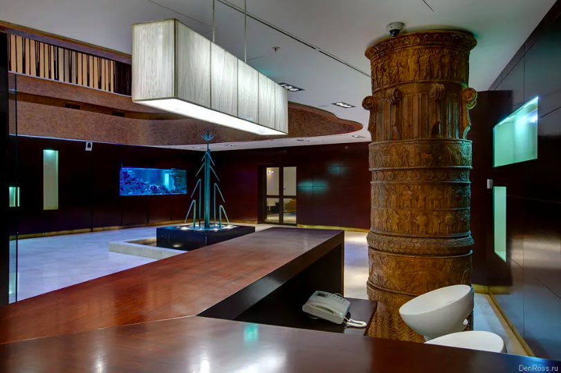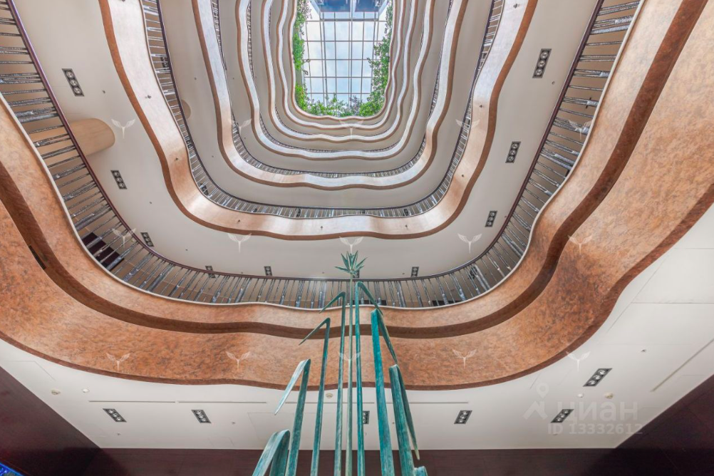 Но главное - вид в холле при взгляде вверх, в первый в Москве атриум! Невольно вспоминаются слова из «Generation „П“»: «Выложенные листами металла стены уходили вверх, образуя плавно утончающийся конус, как будто это был пустой церковный купол, позолоченный изнутри»: