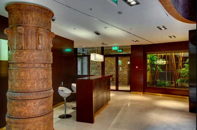 В холле гость сразу натыкается на колонну с барельефами в ассиро-вавилонском стиле (издалека сложно разглядеть, но сильно напоминает известные барельефы на бронзовых лентах ворот царского дворца в Балавате, изображающие поход Салманасара III в Северную Сирию, IX век до н. э., а уж характерных крылатых львов сложно с чем-то перепутать):