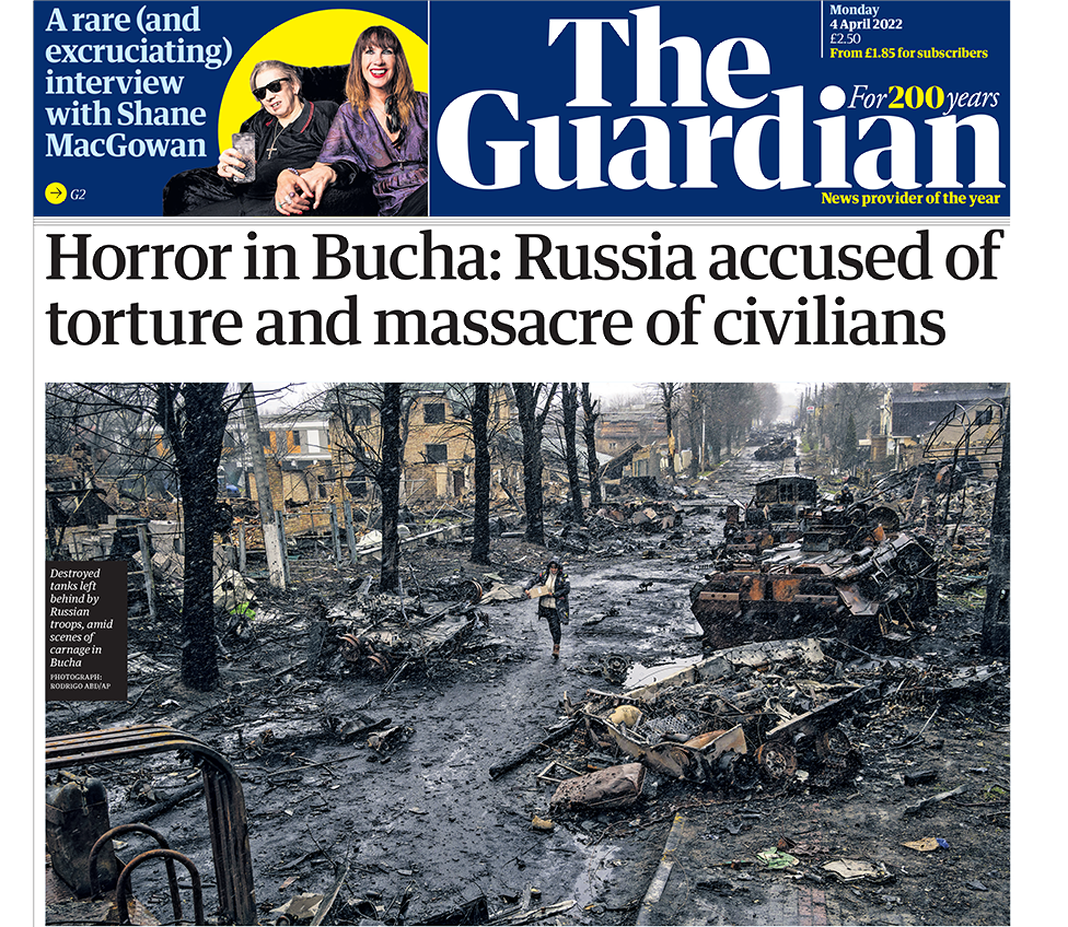 On April 4, 2022, the Western media are roaring against Russia, about the slaughter of civilians in Bucha, a town in Kiev northwestern suburb, Ukraine. The dates and sites of the killings are unknown. The identities of the victims are unknown. The sources are Ukrainian, directly or indirectly officials whose assertions are widely admitted. I am a long time fan of the British media and tabloids. In the United Kingdom, the buzz is a gradient, from Civilians 'shot in the street' [The Times] to Putin last atrocities, GENOCIDE [Daily Mirror]. Here is the cover of The Guardian