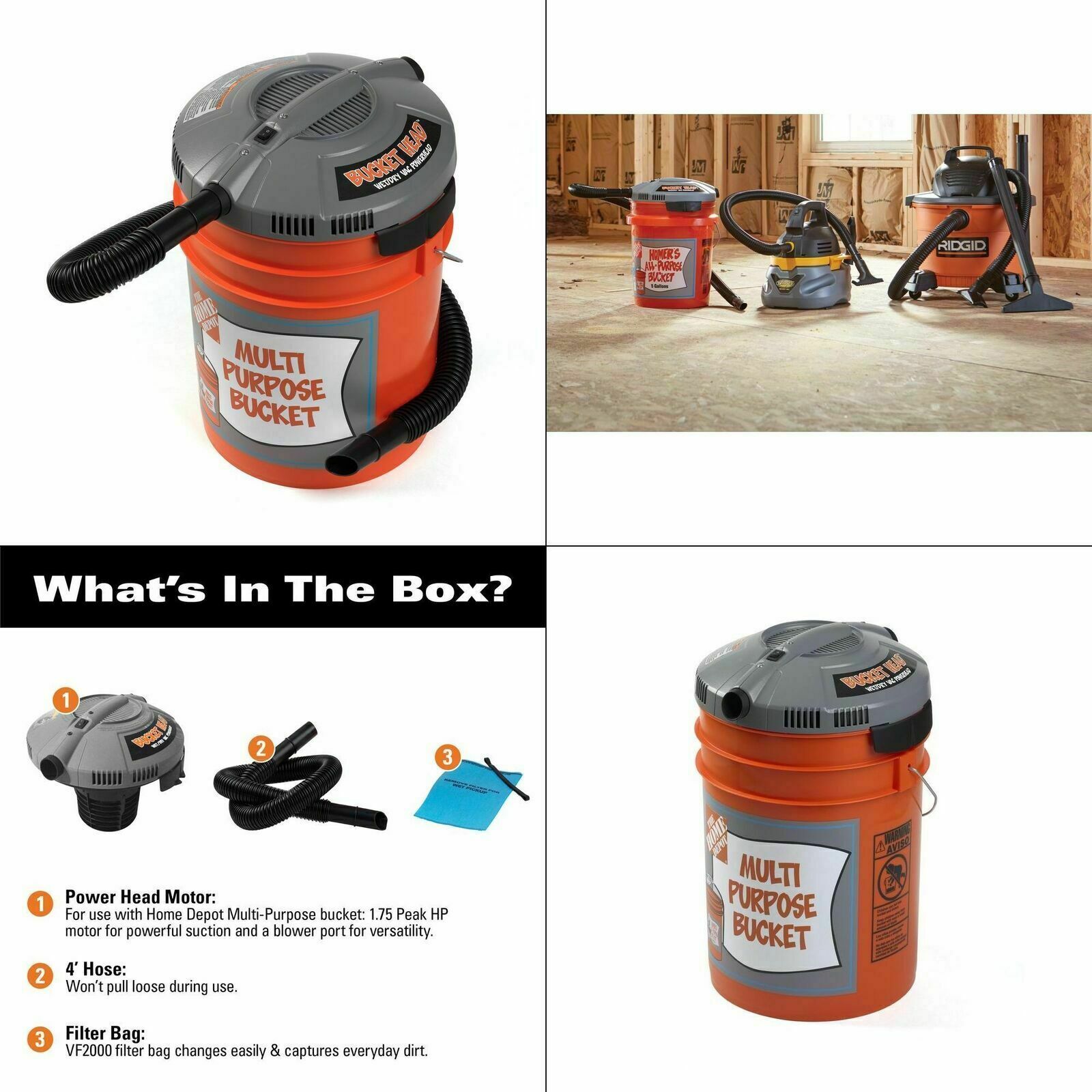 The Bucket Head Wet/Dry Vac Powerhead can be used to turn a The Home Depot brand multi-use bucket (not included) into a powerful wet dry vac . The powerhead features a 1 .75 peak horsepower motor for powerful suction and a blower port for versatility .