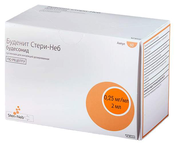 Буденит Стери-Неб для ингаляций - это белая матовая суспензия без специфического запаха, мелкодисперсная . Лекарство выпускается в пластмассовых ампулах из полимера низкой плотности . Объём ампул 2 мл, дозировка по 0,25 и 0,5 мг/мл активного вещества . Ампулы спаяны в виде блока по 5 шт ., их помещают в ламинированную фольгу .