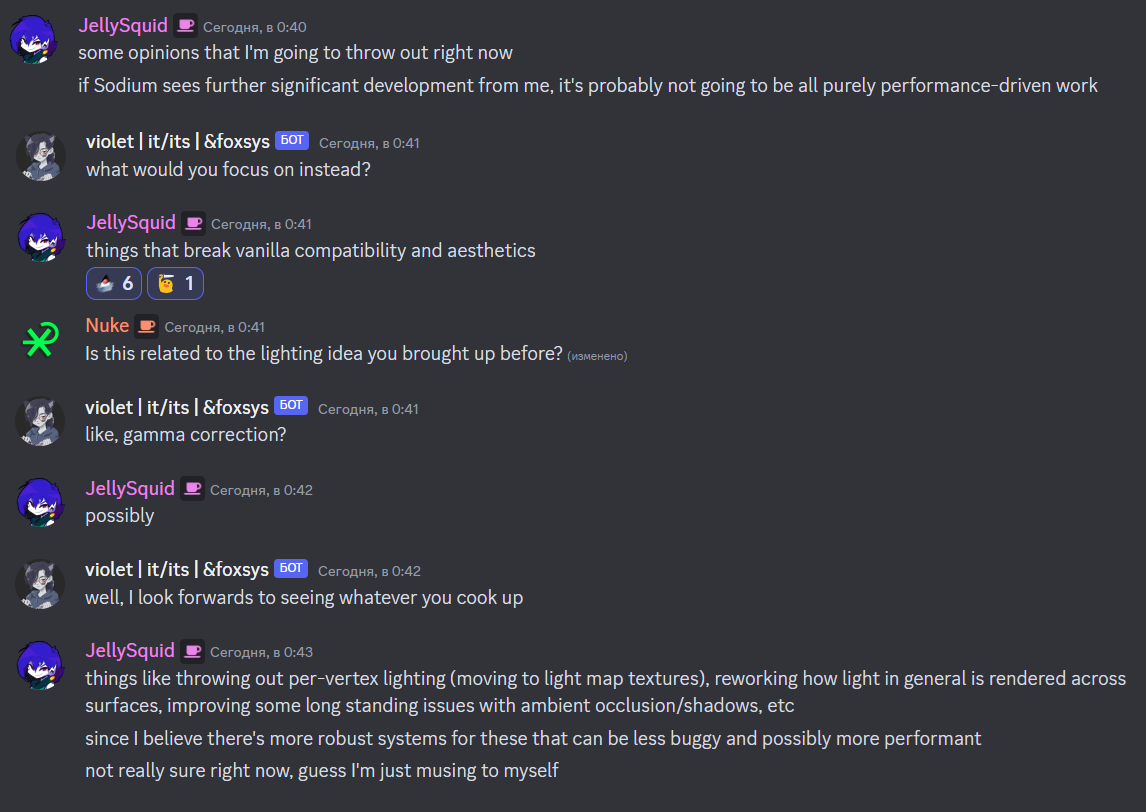 Сейчас Sodium как никогда близок к тому, чтобы стать полноценным графическим движком. От намеченного списка функций, которые нужно реализовать, осталось всего два пункта – это сортировка прозрачности и поддержка Fabric Rendering API. Самое время подумать о будущем проекта. Конечно, можно просто остановиться на достигнутом, но похоже, что у Ангелины на этот счёт другие планы:
