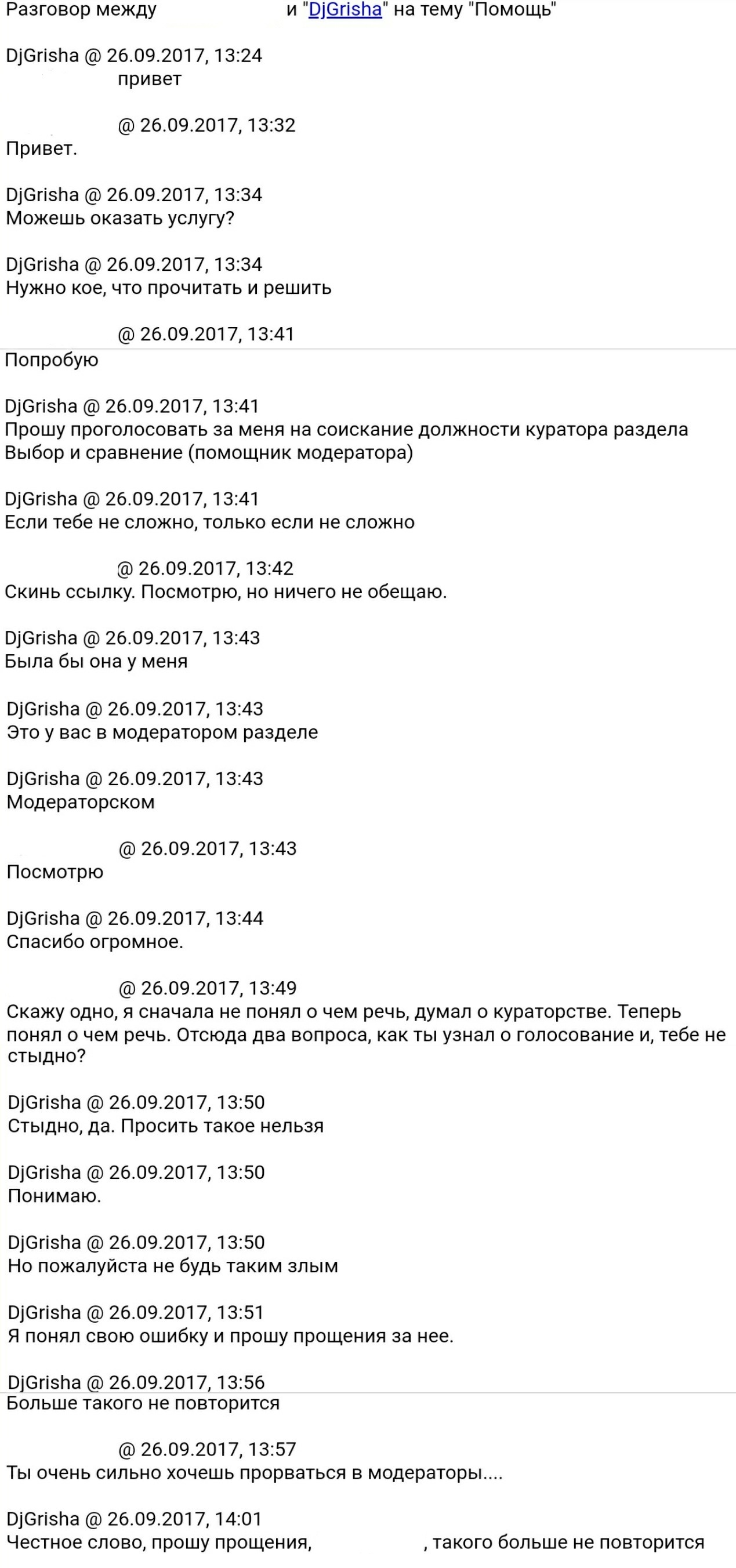 Ситуация может показаться обыденной, если бы не один момент. Ранее Гриша трижды выдвигался на пост помощника модератора и так хотел им стать, что просил чуть ли не всех модераторов проголосовать за него.