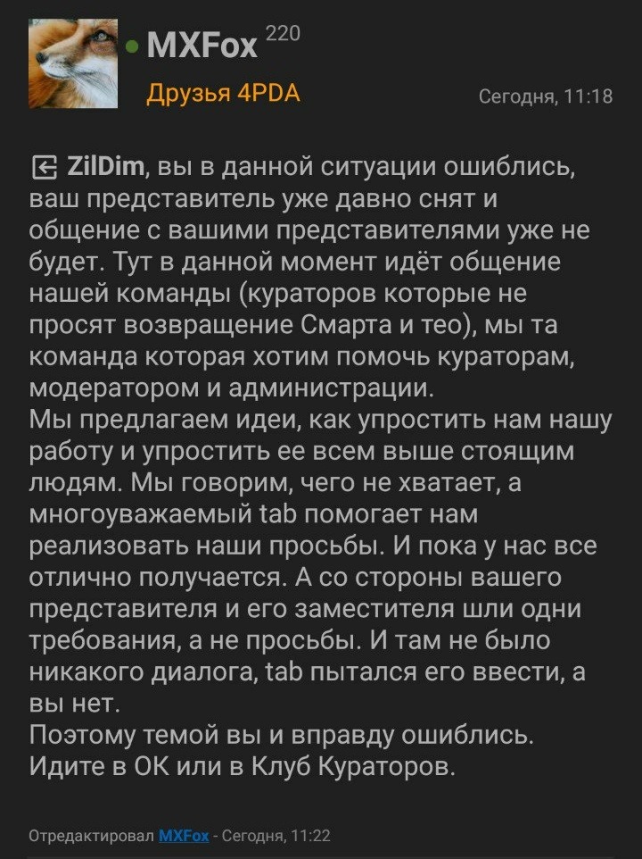 Вчера в теме информирования появился Гриша (MXFox) и начал доказывать, что их правда - единственно правильная, а команда нацелена на "конструктивный" диалог. К сожалению, этот разговор быстро стерли, но ниже мы вам приводим скриншоты.