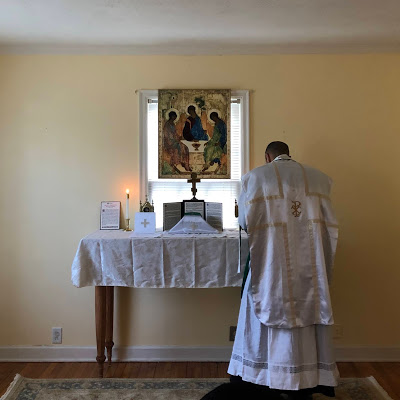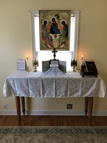 Secondly, the altar, if possible, should have a first class relic on it or at least placed on it for the offering of the Holy Sacrifice of the Mass. Some priests I know travel with a Byzantine antimension. The same prayer said by the priest in the Roman rite when he comes to the altar to kiss it before saying the Introit refers to the relics on and near the altar: "Oramus te, Domine, per merita Sanctorum tuorum [kiss the sacred stone] quorum reliquiae hic sunt, et omnium Sanctorum: ut indulgere digneris omnia peccata mea. Amen" (We beseech Thee, O Lord, by the merits of Thy saints whose relics are here, and of all the saints, to forgive me all my sins. Amen). A priest should be able to help you look for relics.