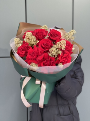 Как выглядит букет роз 40 . . . фото в руках . Букет роз 70 см длина стебля, если без упаковки, то выглядит так (9 штук): 51 роза и длина стебля 70 см - массивный букет, но просто шикарен .
