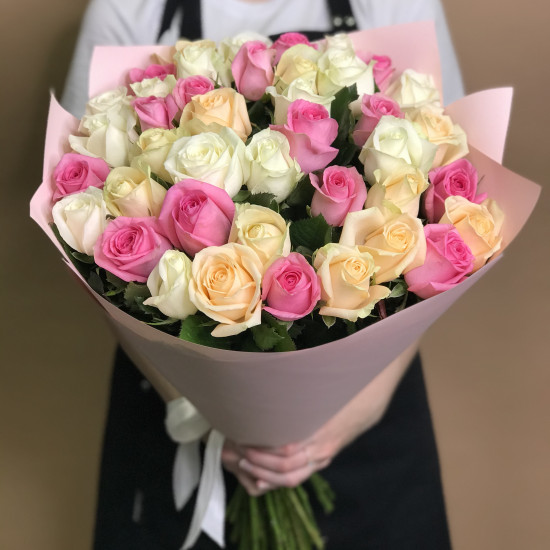 На фото: Букет из 25 роз " микс " (40 см .) На сайте представлены возможные варианты сборки букетов . Каждый из них уникален, так как наличие определённых цветов зависит от сезона .