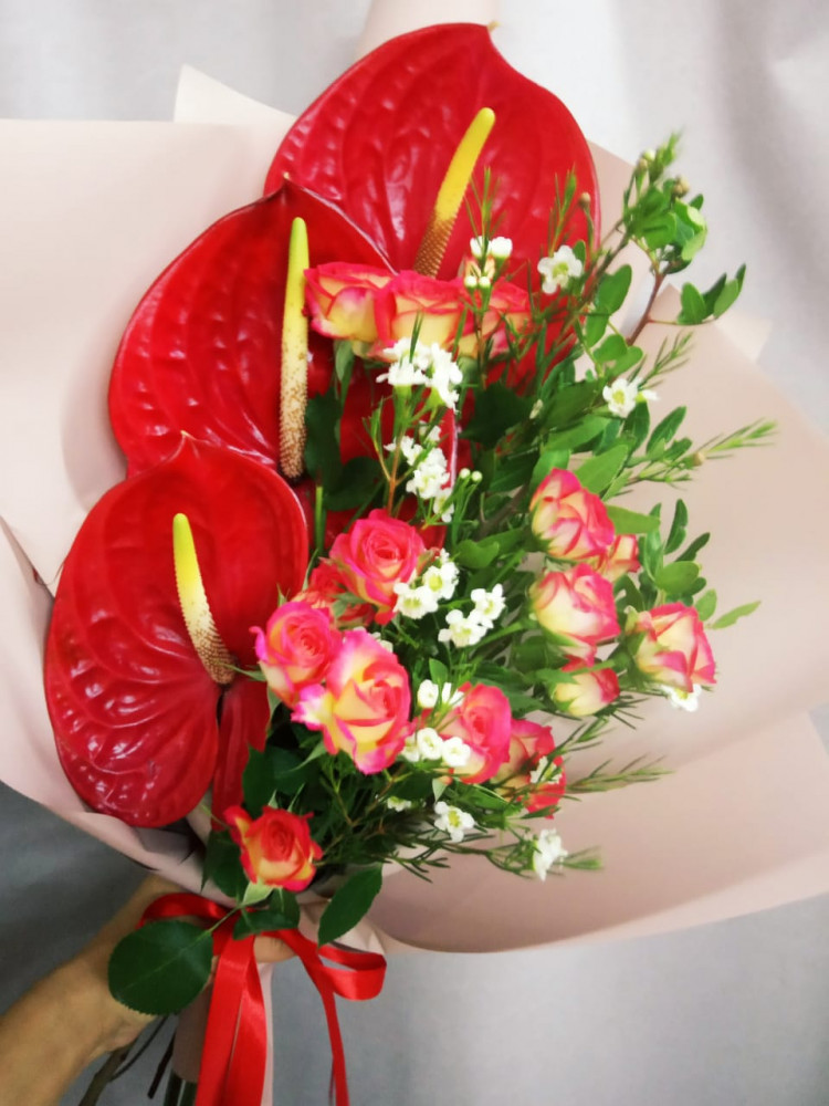 Букет с Антуриумом от студии флористики LABYKET Заказать букет цветов дешево в Красноярске ☎ +7 (913) 562-42-24 .