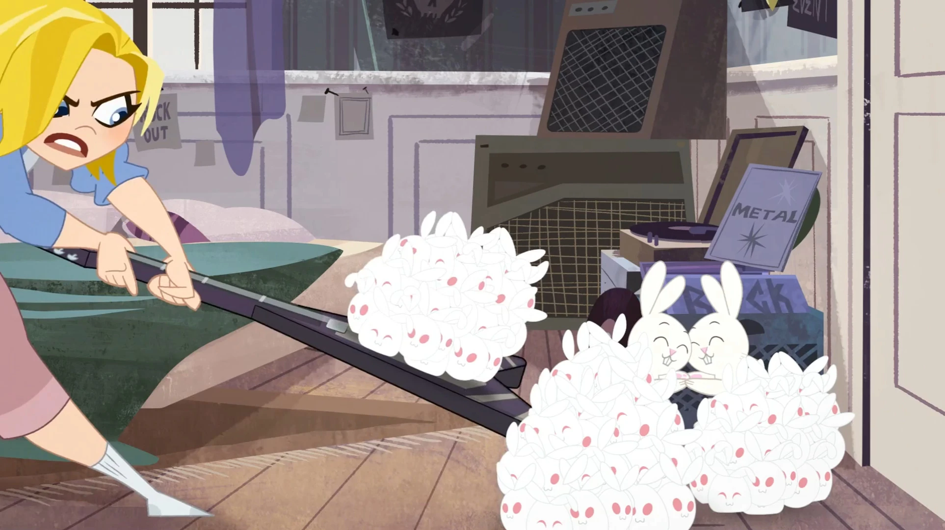 Kara, acting indifferent to the bunnies while Zee is around, immediately baby-talks them when Zee leaves, and takes them out to play with them . The bunnies magically spawn heaps of tiny bunnies which Kara tries to put away, but more and more keep appearing . The bunny spawn spill into the street and flood it .