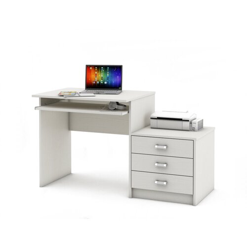 Bureau d'ordinateur avec une étagère coulissante pour clavier et souris. La conception comprend des tiroirs et des étagères pour des dossiers ou une imprimante.