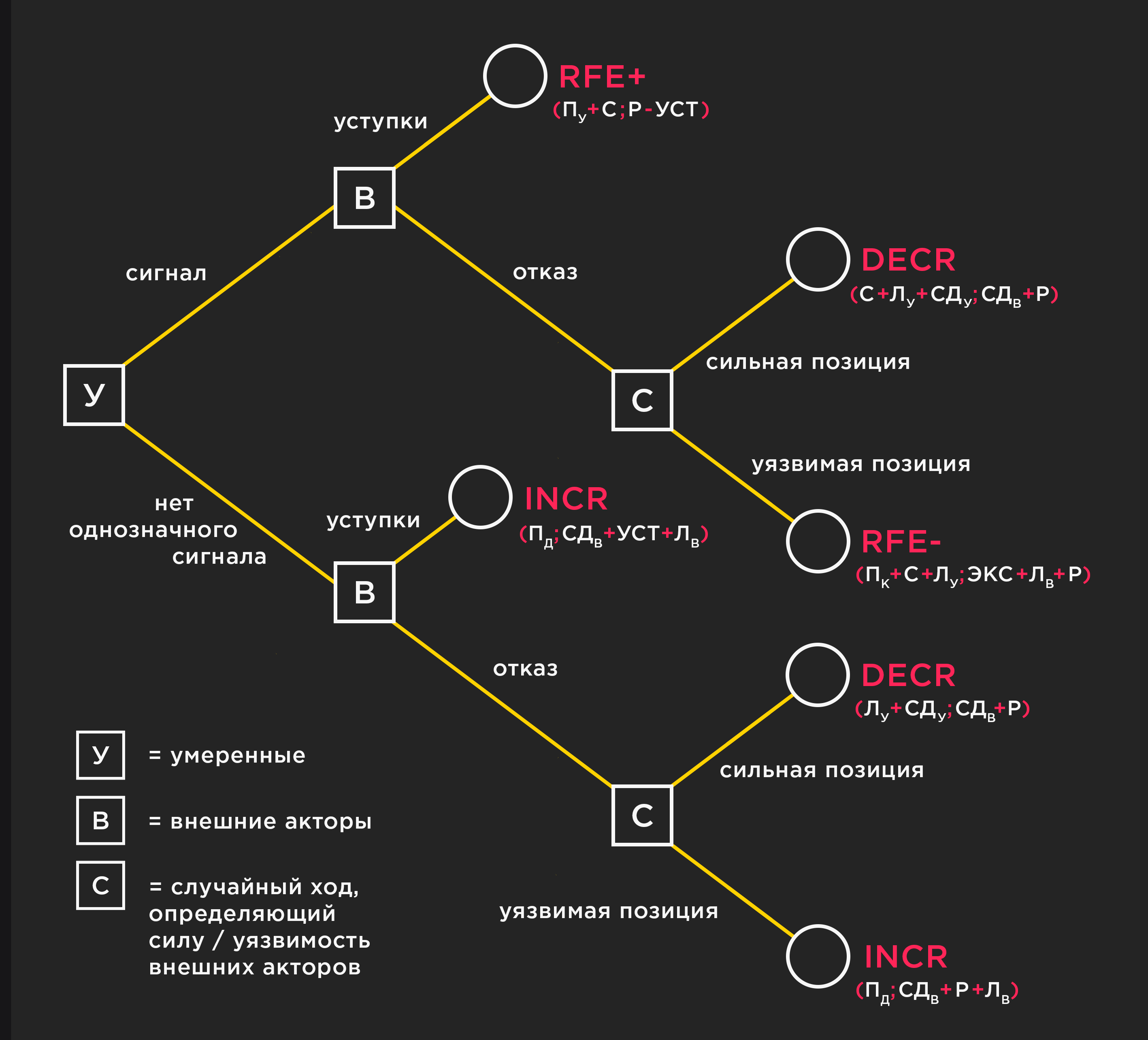 Чтобы объяснить, этот результат был достигнут, мы обратимся к RFE-игре. Государство начинает с предположения, что находится в позиции силы. Будучи автократическим режимом, у которого нет недостатка в способности к принуждению и в решимости использовать эту способность до самой крайней степени, оно оценивает убытки и выгоды выбора между уступкам умеренным или отвержением умеренных и подавлением всего движения. И выбирает отвергнуть умеренных. В верхней части дерева решений, цена репрессии была приемлима, а воспринимаемые прибыли от ослабления движения (СДв) казались достаточно привлекательными, чтобы игнорировать возможный опасный эффект усиления крайних.