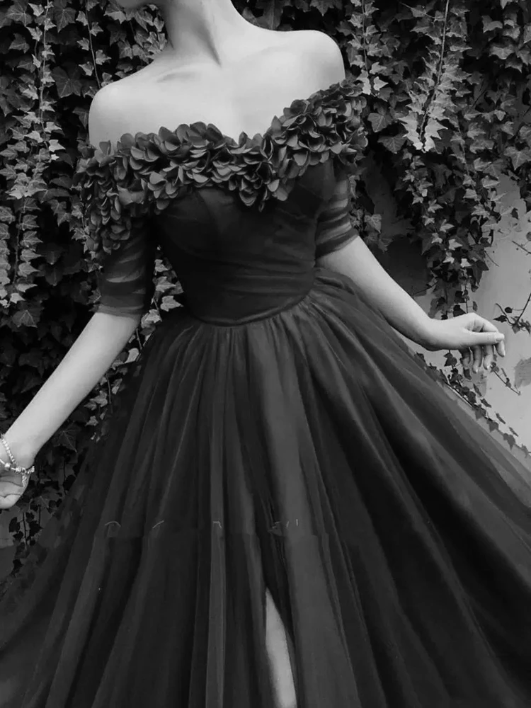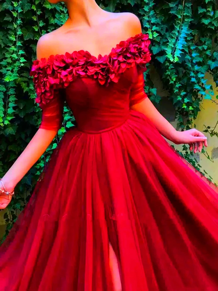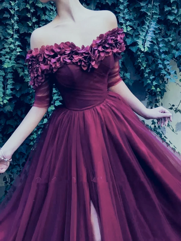 "Burgundy Off The Shoulder Tulle A Line Long Evening Dresses 2023 Short Sleeves Ruched Split 3D Floral Formal Party Prom Dress" * Buy Now Just For 169$
