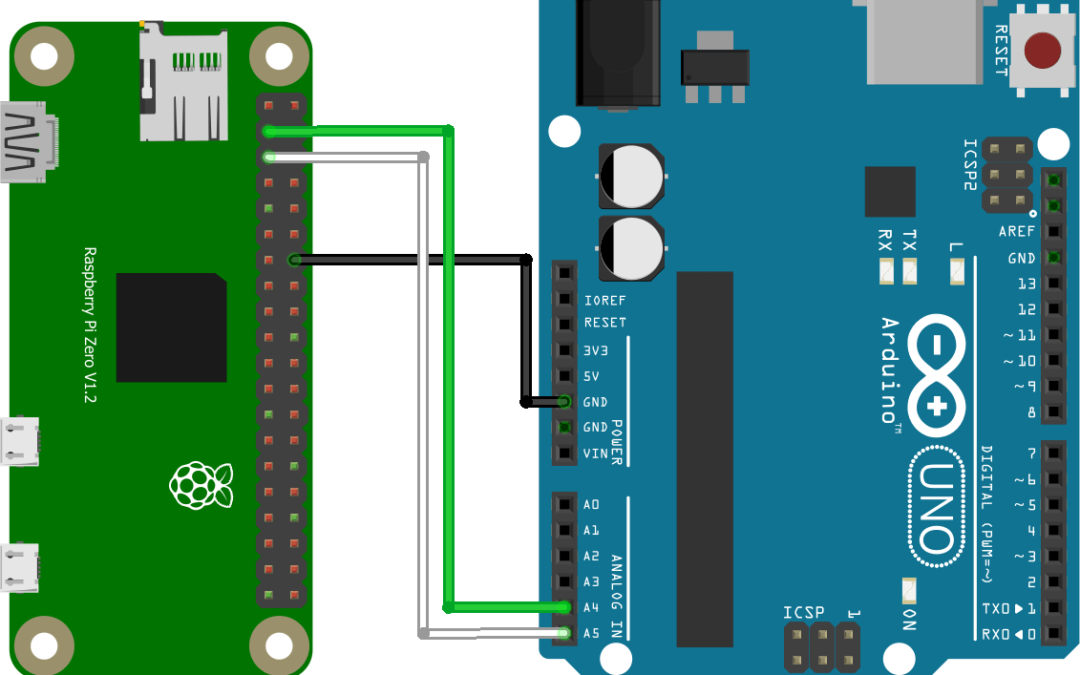 Para establecer la comunicación I2C entre Raspberry Pi y Arduino, necesitamos conectar físicamente el bus que utiliza 3 pines. Una comunicación I2C se define por un bus de dos cables (a veces llamado TWI, Two Wire Interface) y una dirección. Los pines utilizados para la comunicación I2C suelen estar fijados para cada dispositivo. Una en la que se envían los datos (Línea de datos en serie SDA) y otra en la que se envía el reloj de sincronización (Línea de reloj en serie SLC). Los fundamentos de las dos cartas deben estar conectados para establecer una referencia potencial común.