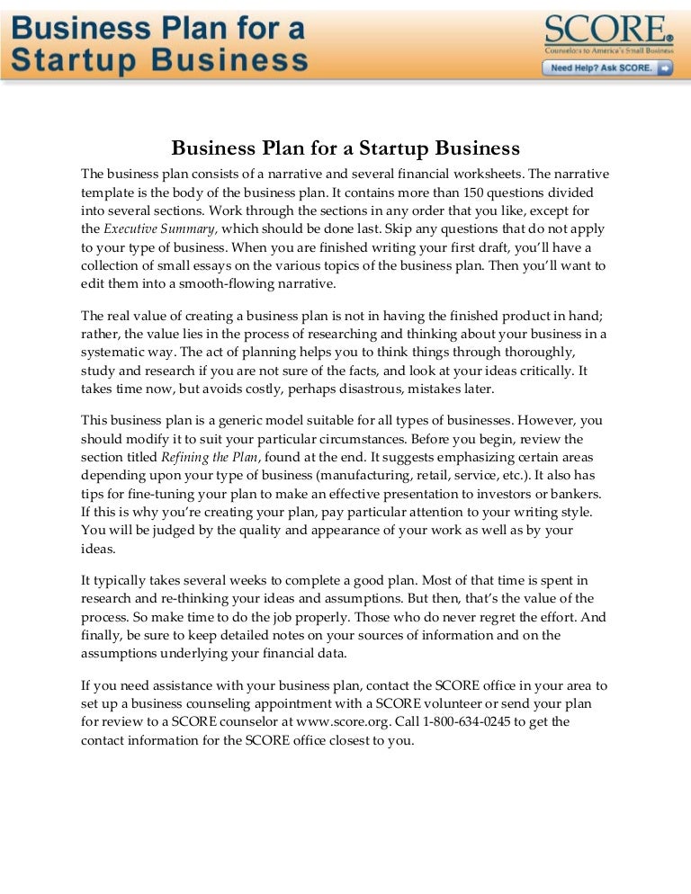 Complete the Business Plan Template for a Startup Business to create a working business plan for your startup . Then, contact your local SCORE mentor to review and refine your plan either online or in person . IN PARTNERSHIP WITH Deluxe . For more than 100 years, Deluxe Corporation has sought to create the tools that help shape our economy .