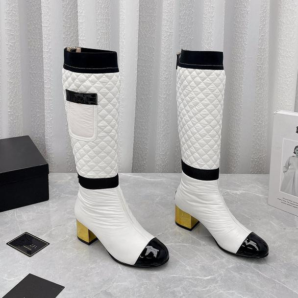 Buy now Luxury electroplatings high-heeled down high-top knight boots color-blocking but knee-warming black and white high heel fashion Knee boots for $87 right now with delivery