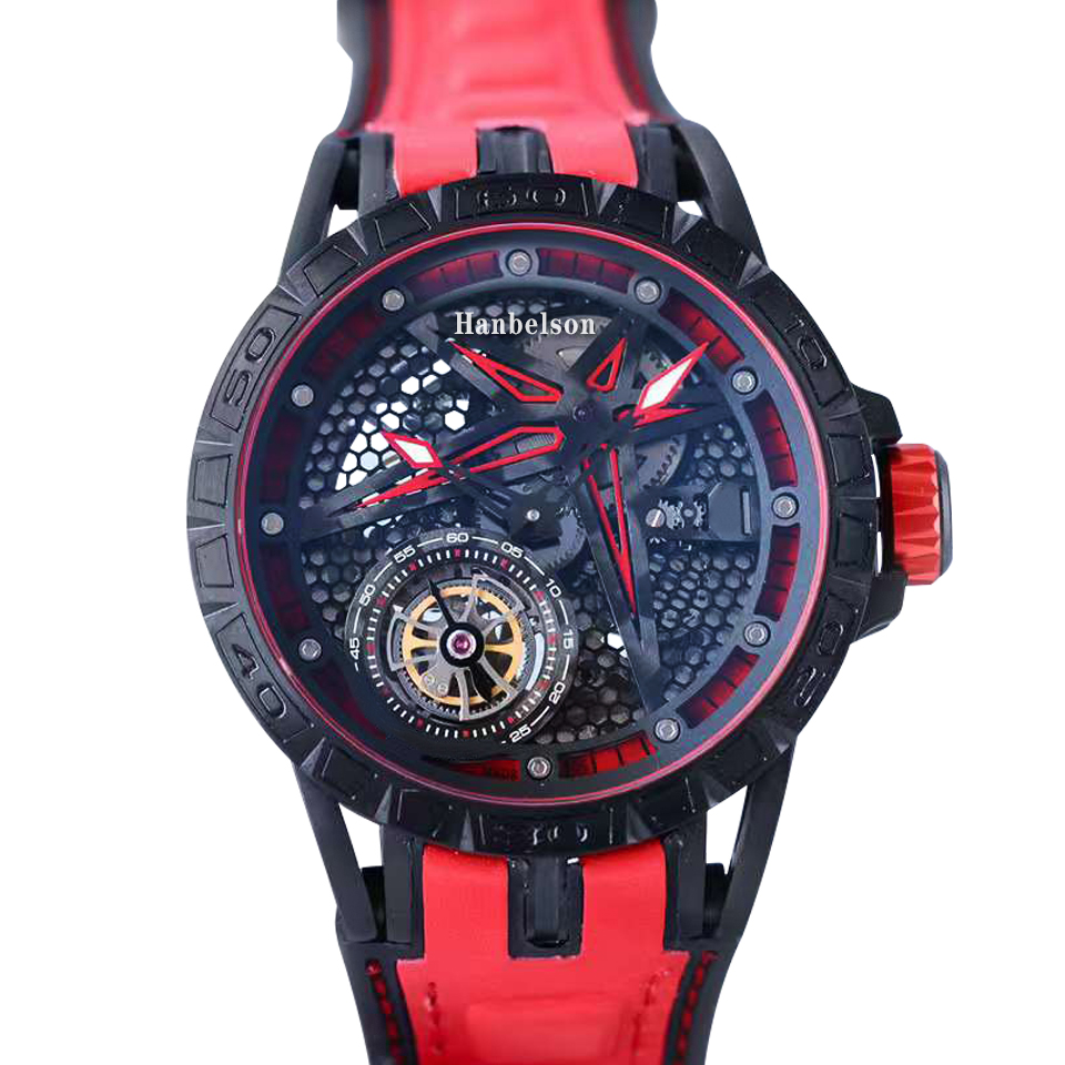 Introducing the >Tourbillon Skeleton Dial Mens Watch Miyota Automatic movement Black Case Transparent Glass bottom Sport Red leather Rubber strap Wristwatches< with the best price - only for $153