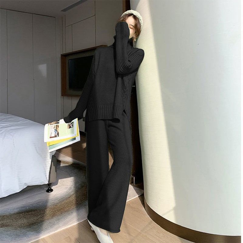 Buy now Women s Two Piece Pants Autumn Winter Korean Edition Goddess Languid Is Lazy Wind Turtleneck Split Sweater Wide legged 2 Loose Knitted Suits 221206 for $42 right now with delivery