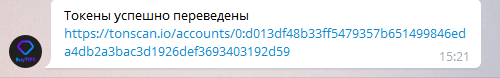 После перевода бот пришлет сообщение с сылкой на транзакцию