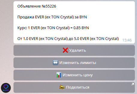 Нажав на объявление вы можете изменить цену, лимиты или удалить объявление, а так же можете поделится им