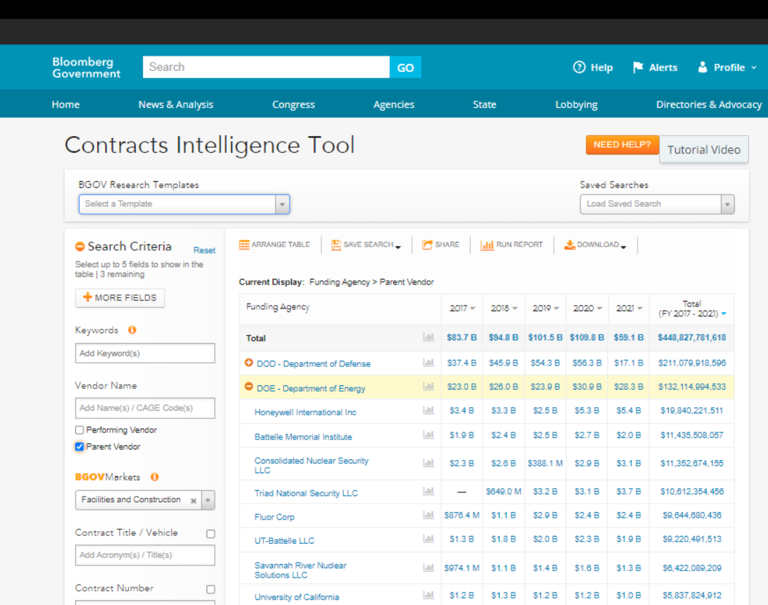Но вернемся к нашим индустриальным компаниям. Составив себе шортлист фундаментально привлекательных (что бы мы под этими словами ни понимали) имен, мы ищем возможности оценить, насколько они способны быть выгодоприобритателями от нашего первичного тезиса - роста госрасходов. Хорошим предиктором будущих выигранных госконтрактов логично считать прошлые выигранные госконтракты. На нашу удачу, блумберг дает полный фукнционал для исследования рынка госконтрактов, релевантных законопроектов, активности лоббистов и многого другого. Находится он по логичному адресу BGOV: