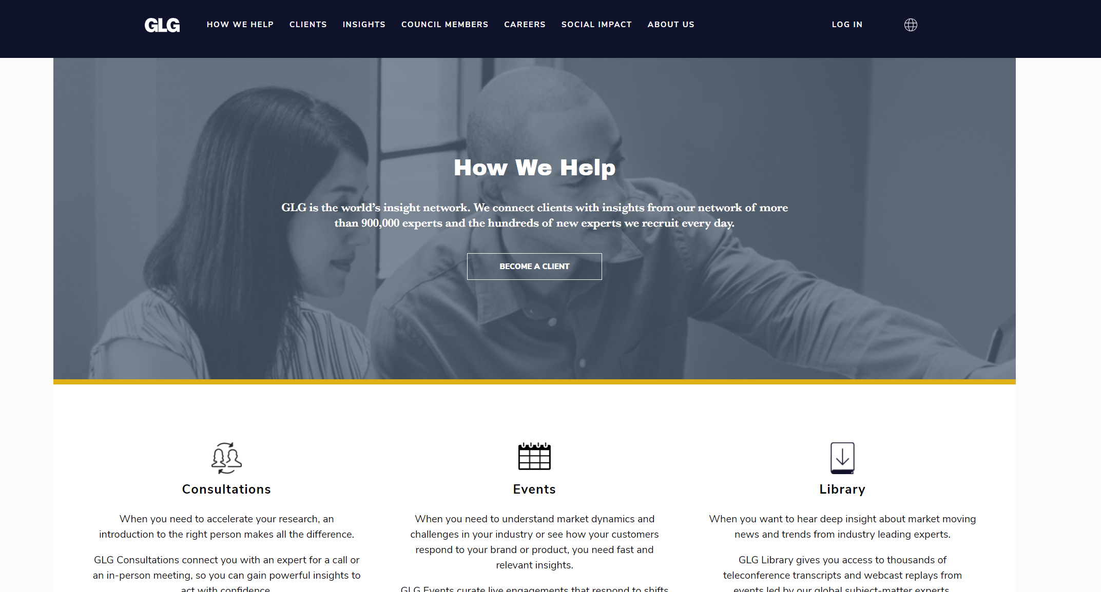 GLG объединяет сотни тысяч бывших и нынешних экзектьтивов, ученых, политиков и специалистов всех возможных типов, давая им возможность дорого продавать свою экспертизу по телефону. Клиенты GLG - инвестиционные фирмы всех мастей, которым нужны специалисты для консультации в темах от применяемых технологий искусственного оплодотворения в Исландии до особенностей маркетинга потребительских товаров в Монголии.