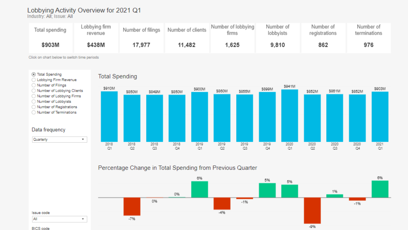 Если вам интересно отследить, сколько та или иная компания за отчетный период заплатила вашингтонским лоббистам, кому именно и что они там лоббировали - спасибо американским институтам, эта информация тоже тщательно записана и публична доступна, в терминале и вне его: