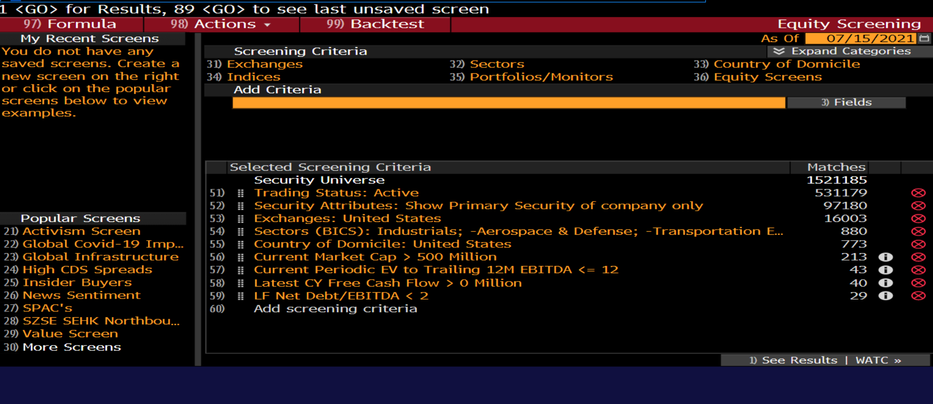 Начать мы можем с построения вселенной релевантных имен, для чего есть два способа: скринер компаний в терминале или исследование секторального индекса. Начнем со скринера: он предстает перед глазами по команде EQS и позволяет отфильтровать все публичные компании планеты практически по любому критерию, который придет в голову. При желании, список можно отфильтровать так, чтобы в нем были только те компании, у CFO которых день рождения совпадает с вашим.
