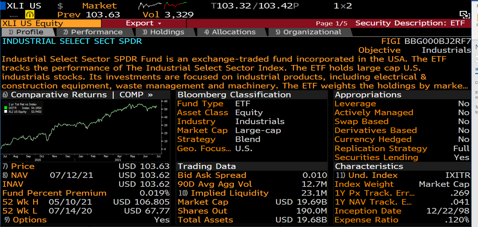 От крупных провайдеров самым размерным по объему активов оказывается SPDR Industrial Select Sector (XLI), который мы коротко осматриваем на странице DES, прежде, чем перейти к разбору конкретных имен.
