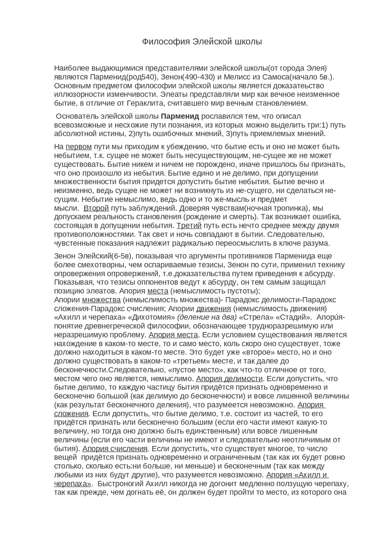Бытие лежит (покоится), оно пребывает в вечности, а не во времени . Зенон Элейский (около 490-430 до н .э .) - любимый ученик и последователь Парменида . Апориия («безысходность, безвыходное положение») — это вымышленная, логически верная, ситуация (высказывание, утверждение, суждение или вывод), которая не может существовать в реальности .