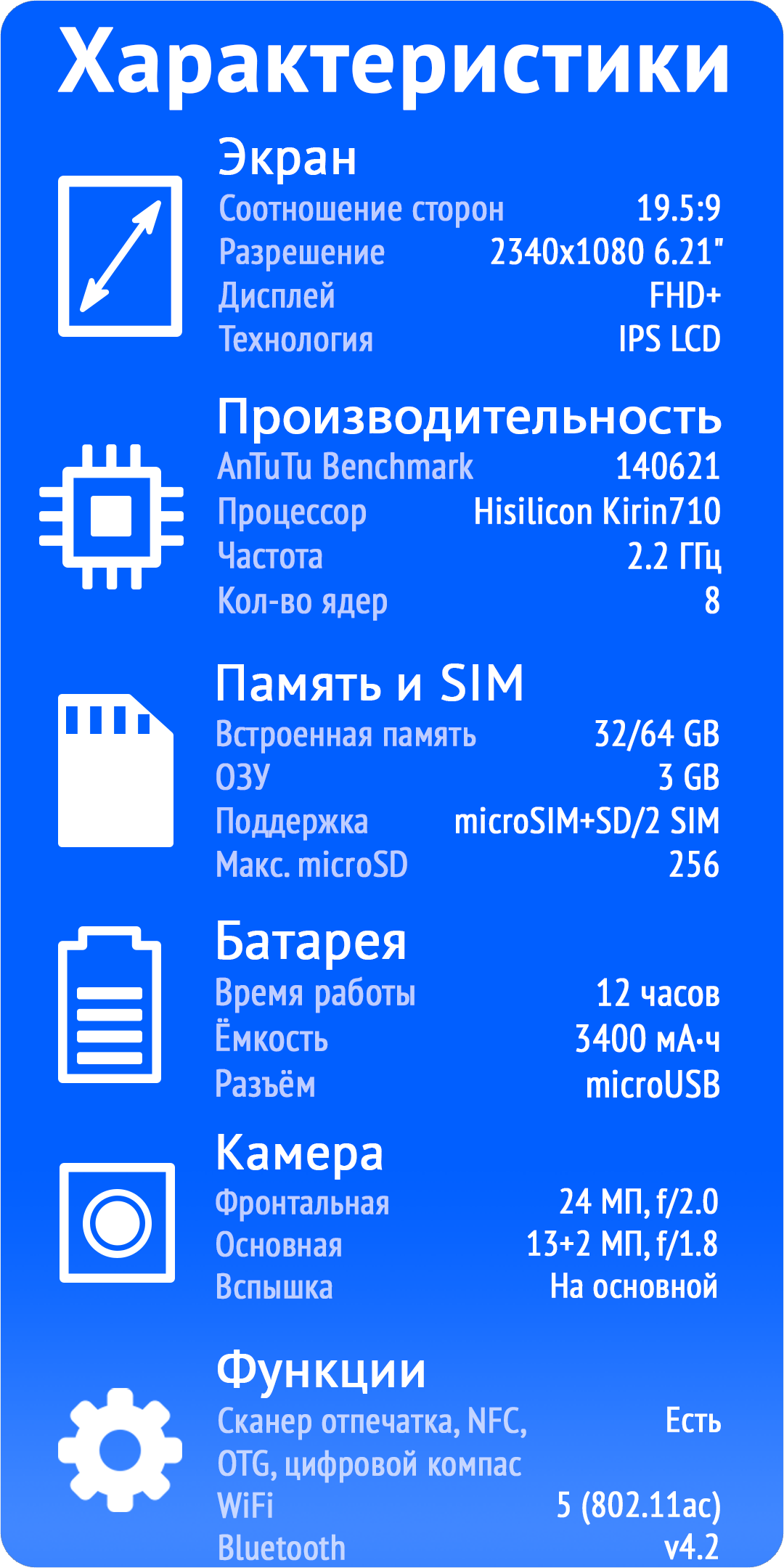 Что можно сказать о зарядке смартфона, так это то, что его хватит на утро-вечер использования без тяжёлых игр и просмотров фильмов без остановок. Т.е. её вполне хватит для обычного использования в течение дня. Заряжается смартфон быстро – 2-2.5 часа, и Honor 10 Lite заряжен на полную. В этом смартфоне соответствующего ценового сегмента нет защиты от пыли и влаги. А теперь о характеристиках…