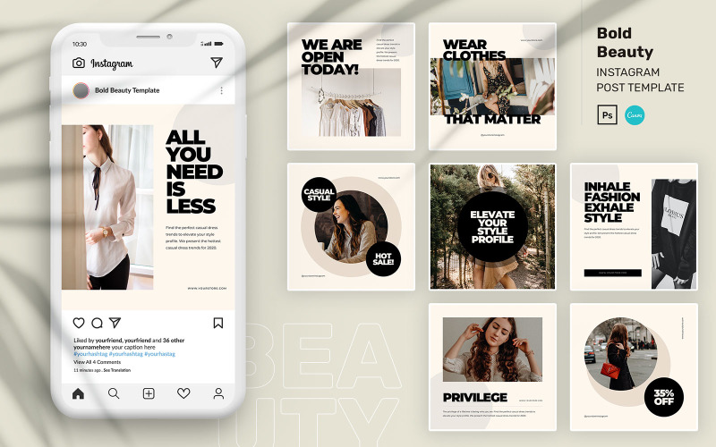 It is optimized for Instagram, but thanks to square, vertical and horizontal templates you can use it in any social media platform including blogs . This package included 12 unique templates posts and 6 stories . You do not need Photoshop to edit these templates . To use the template on the phone, you will need to download any of the applications . . .