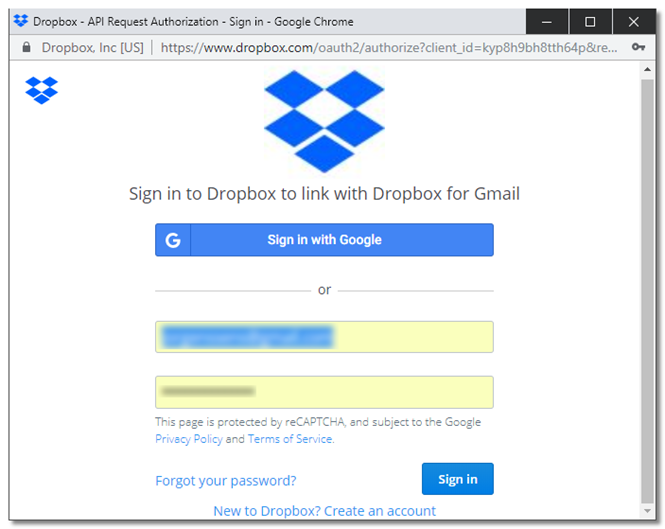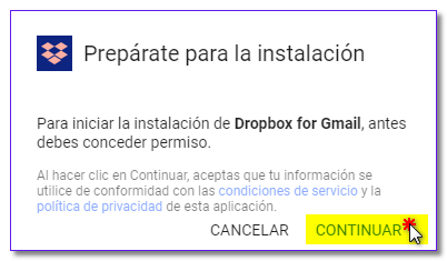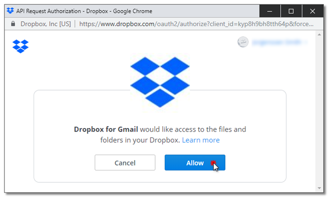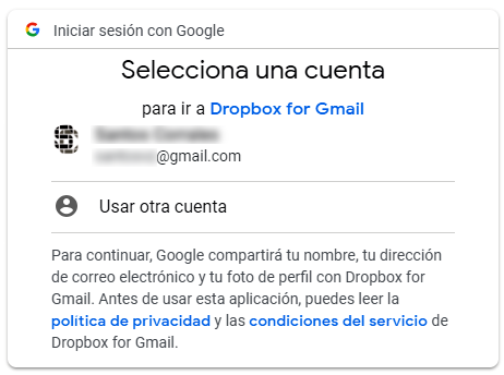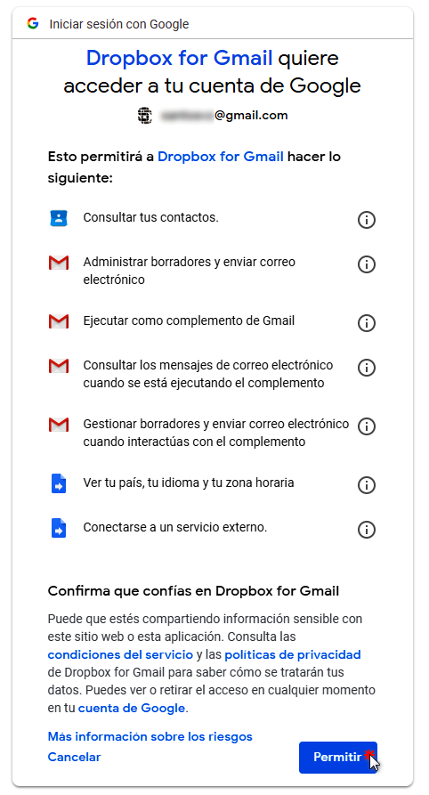 Una vez iniciada la sesión, aparece la opción de autorizar a Gmail el acceso a la cuenta de Dropbox.