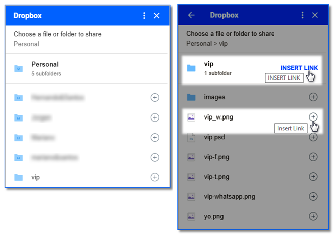 Una vez aceptada la autorización, se abrirá el directorio de la cuenta de Dropbox para acceder a cada uno de las carpetas y archivos e incluir el enlace a los archivos que se desean adjuntar al correo que se está realizando, que equivaldría a compartir un archivo o directorio.