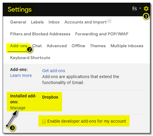 Si desea desinstalar el complemento de Dropbox para Gmail o cualquier otro complemento (Add-ons) que tenga instalado en Gmail, tan solo debe seguir el siguiente procedimiento:
